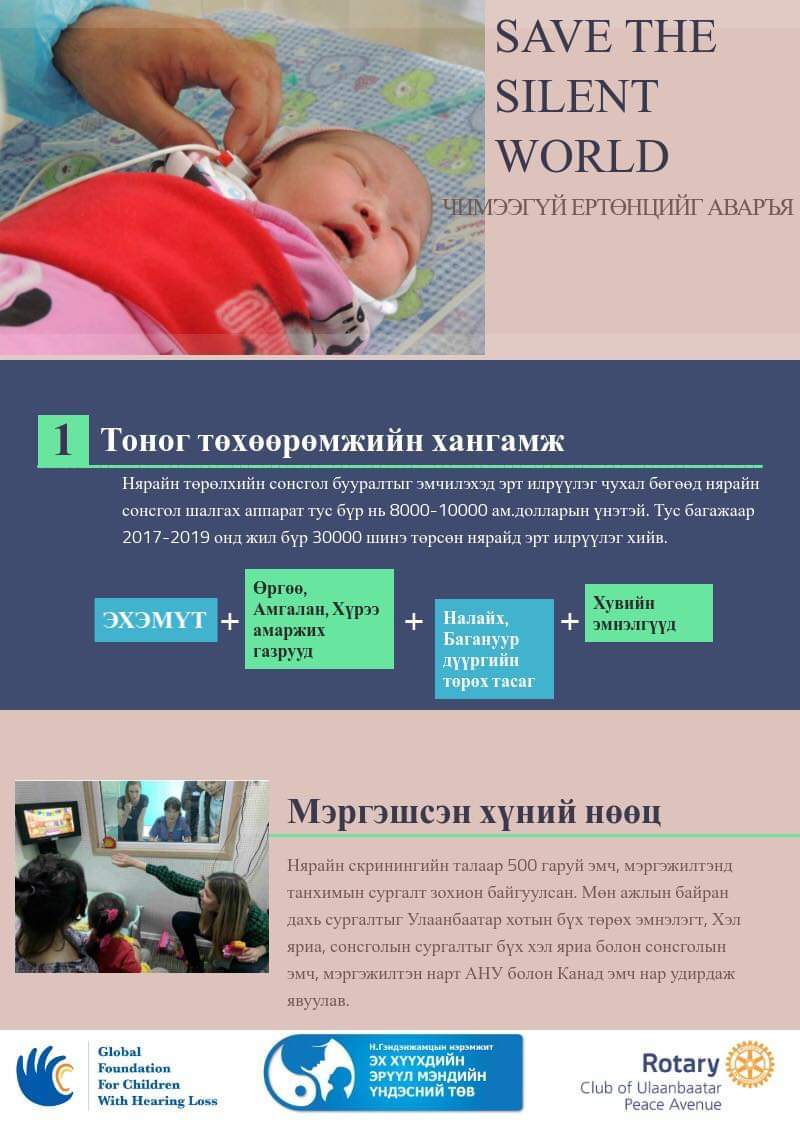 Энэ төслийн талаар ЭХЭМҮТ-ийн Чих хамар хоолой, сонсгол судлалын эмч Ч.Саруул, “2012 оноос хойш манай төв дээр нярай хүүхдийн сонсголыг шалгаж эхэлсэн. Монгол улсын шинэ төрж байгаа иргэний хагасаас илүү нь мэндэлдэг Улаанбаатар хотын ганцхан төвд нярайн сонсголын илрүүлэг хийнэ гэдэг маш хангалтгүй байсан. Улаанбаатар Пийс Авенью Ротари клубын залуусын санаачилсан, Сонсголын бэрхшээлтэй хүүхдүүдийг дэмжих дэлхийн сангийн хамтран хэрэгжүүлж байгаа “Чимээгүй ертөнцийг аваръя” төсөл ЭХЭМҮТ-ийн захирал Ш.Энхтөр болон Чих хамар хоолойн мэс заслын тасгийн хамт олны дэмжлэгээр үндэсний хэмжээнд ганц байгаа хүүхдийн эрүүл мэндийн лавлагаа төв дээр 2017 оноос төвлөрч хэрэгжиж эхэлсэн. ЭХЭМҮТ нь нярайн скринингийн үндэсний лавлагаа төвийн хувьд бусад амаржих газар, эмнэлгүүдийн эмч, эмнэлгийн мэргэжилтэнг сурган дадлагажуулах, мэргэжил арга зүйгээр хангах, олон улсын болон дотоодын сургалт зохион байгуулах, сонсгол бууралтыг эрт илрүүлэх, оношлох, сонсгол оруулах дунгийн суулгацын болон чичиргээнт суулгацын мэс заслыг хийх, хэл заслын хөтөлбөрт хүүхдүүдийг хамруулах зэрэг олон үйл ажиллагааг зангидагч бааз болж байна.