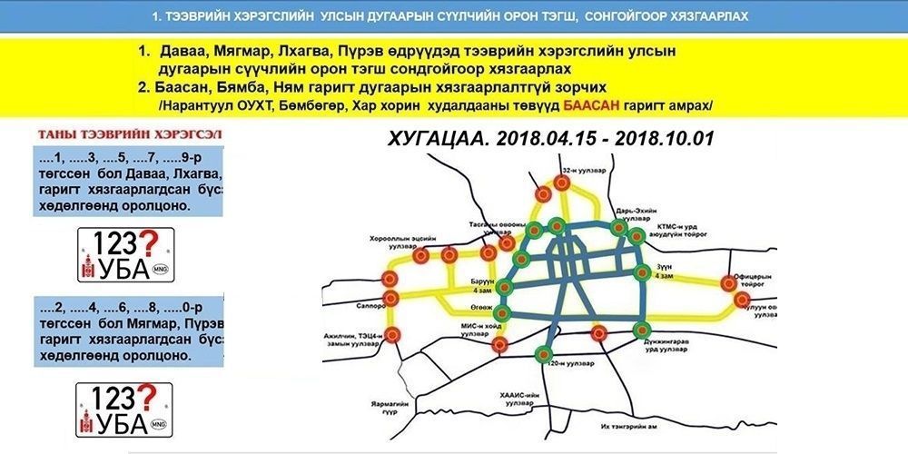 Жич: Дэд бүтцийн бүтээн байгуулалтын ажлын үеэр замын түгжрэлийг бууруулахын тулд Нийслэл болон Замын цагдаагийн алба хамтран дугаарын хязгаарлалт хийх саналыг мэргэжлийн байгууллагуудын хийсэн судалгааг үндэслэн гаргасан болно.