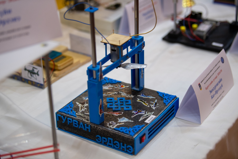 ШУТИС-ийн харьяа ерөнхий боловсролын ахлах сургуулийн сурагч Б.Энэрэл, "Миний бүтээл ачаа өргөх зориулалттай, сэнсний зарчимд суурилсан загвар юм. Энэхүү бүтээлийн онцлог нь гар утасны аппликэйшнээр удирддаг. Аппликэйшнийг QR кодоор татан авч холбогдсоны дараа сэнсний эргэлтийн хурдыг тохируулж, улмаар аппликэйшн доторх хяналтын хэсгээр дамжуулан сэнсийг ажиллуулж, ачааг дээш өргөх үйлдлийг алсаас удирдах байдлаар шийдсэн.