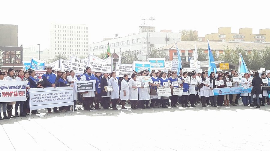 Цалингаа нэмүүлэхийг хүссэн эмч, багш нарын жагсаал. Үүнээс хойш ийм жагсаал хуулиар хориотой.