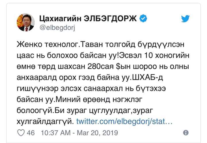 Тэгвэл Ерөнхийлөгч асан Ц.Элбэгдорж дээрх асуудалтай холбогдуулан өөрийн твиттер хуудаснаа ийн жиргэжээ.