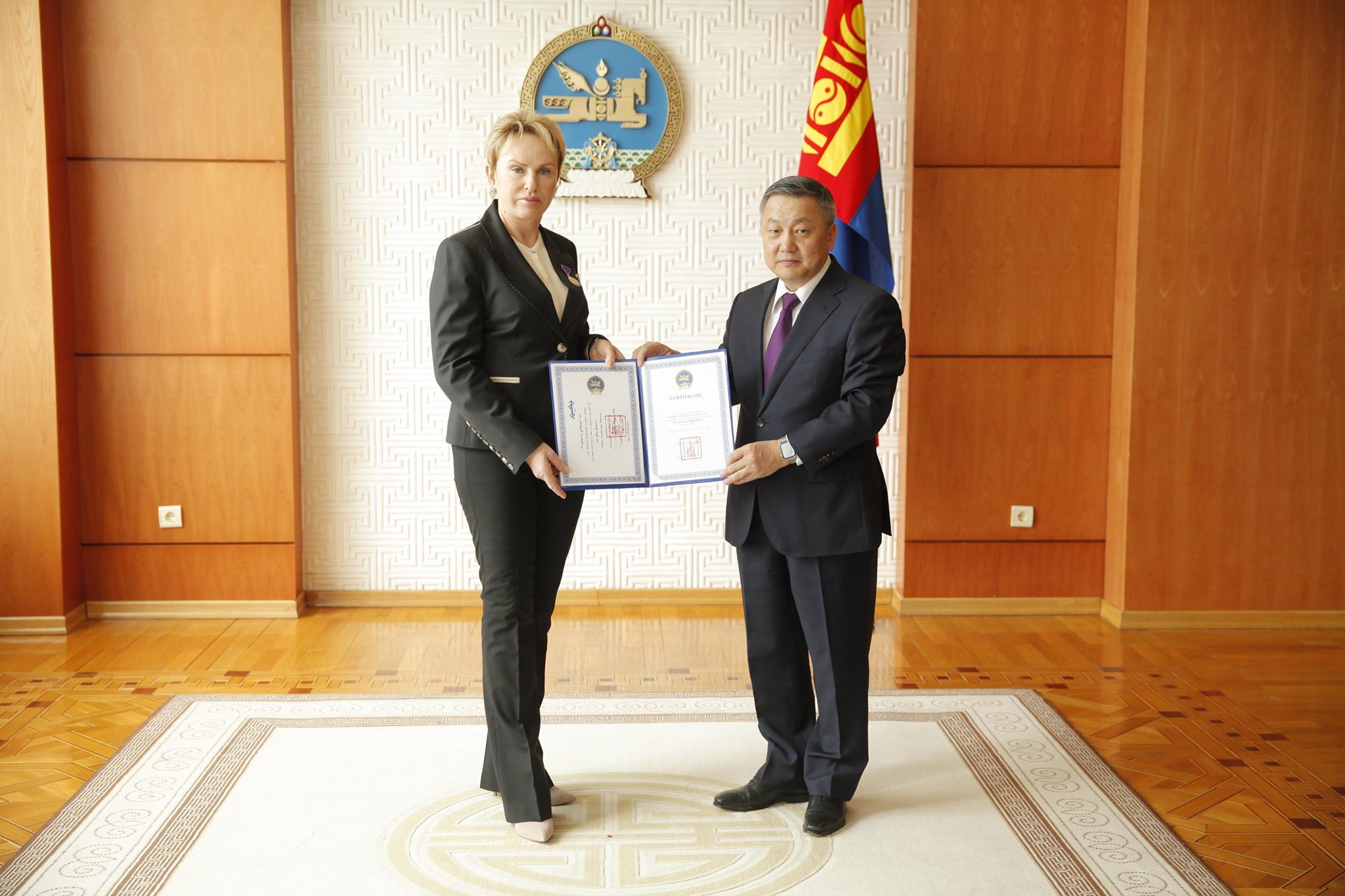 Шагналыг өнөөдөр Монгол Улсын Ерөнхийлөгчийн Тамгын газрын дарга З.Энхболд Төрийн ордны Ёслол хүндэтгэлийн танхимд гардуулж, дараа нь баяр хүргэн хүлээн авч уулзав.