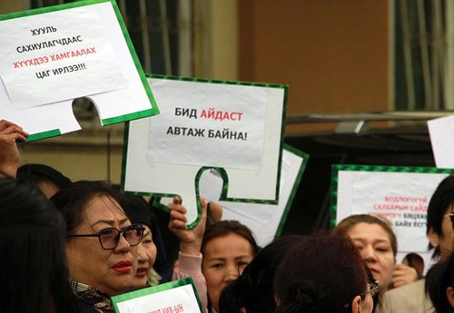 Хууль зүйн яамны гадна талбайд эмэгтэйчүүд жагсаж байна