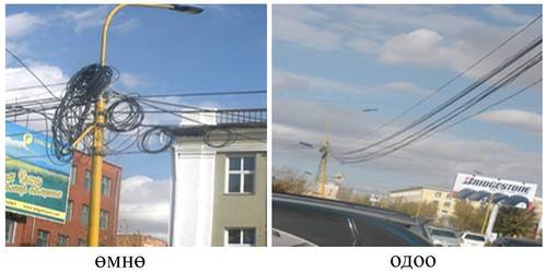 Гэрэлтүүлгийн шон дээгүүр татсан шилэн кабелийг цэгцэлж байна