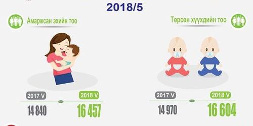 2018 оны эхний 5 сард нийслэлд 16457 эх амаржиж, 16604 хүүхэд мэндэлжээ. Үүнээс 8535 нь эрэгтэй хүүхэд, 8069 нь эмэгтэй байна. Шинэ төрсөн нийт хүүхдийн 239 нь 2 ихэр, 7 нь 3 ихэр бүртгэгджээ.