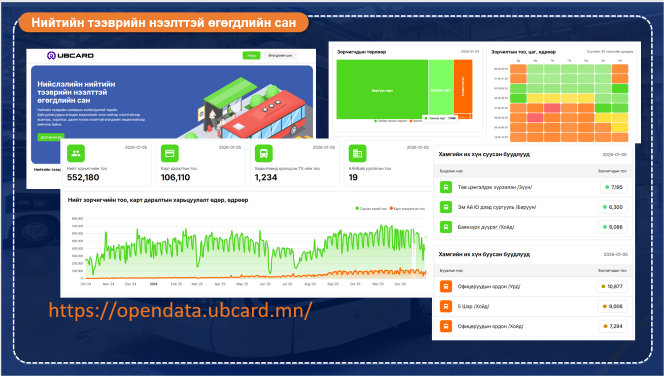 Нийтийн тээврийн бодлогын газарт их, дунд багтаамжийн 1286 автобус бүртгэлтэй байгаагаас өдөрт дунджаар 1183 автобус Улаанбаатар хотын нийтийн тээврийн үйлчилгээнд гарч, өдөрт дунджаар 500 мянга гаруй иргэдэд үйлчилж байна. Тухайлбал, өчигдрийн байдлаар нийтийн тээврээр нийт 552.182 хүн зорчжээ. Төв цэнгэлдэх хүрээлэнгийн зүүн буудлаас хамгийн их буюу 7000 гаруй зорчигч суусан бол Офицеруудын ордны урд буудалд хамгийн их буюу 10.000 гаруй зорчигч буусан байна. Түүнчлэн нийтийн тээврийн төлбөрийн менежментийн системийг хөгжүүлж, нийтийн тээврээр зорчсон төлбөрийг зориулалтын картаас гадна банкны карт, гар утасны аппликейшн, QR код, бэлэн мөнгө зэрэг төрөл, хэлбэрээр төлөх боломжийг бүрдүүлэн ажилласнаар 2025 онд 171.9 сая зорчигч тээвэрлэж, 56.4 тэрбум төгрөгийн орлого төвлөрүүлсэн нь өмнөх оны мөн үеэс 24.9 сая зорчигч илүү тээвэрлэж, 23.1 тэрбум төгрөгийн орлого илүү төвлөрүүлсэн үзүүлэлттэй байна. Мөн тэргэнцэртэй иргэн нийтийн тээврээр үйлчлүүлэх хүртээмжтэй байдал 2022 онд 56 байсан бол 2026 оны 1-р сарын байдлаар 1009 болж 73.7%-иар нэмэгдсэн байна.