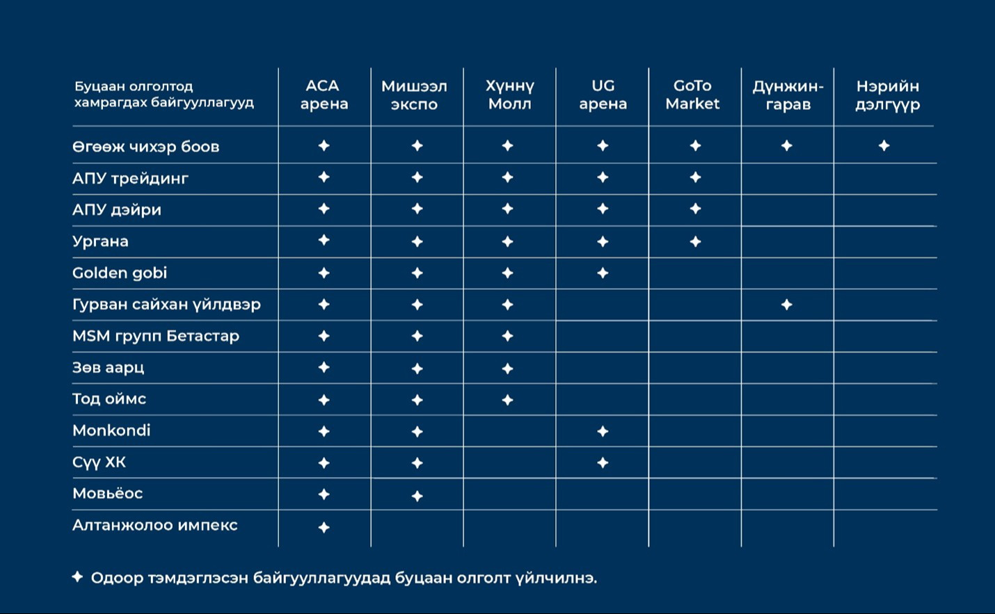 Кредит карт шинээр захиалж, амжилттай гүйлгээ хийсэн харилцагчид SocialPay аппликэйшний “Нэмэлт цэс-Миний купон” цэсээр дамжуулан купоноо шалгах бөгөөд купон тань 2026.03.31-нийг дуустал хүчинтэй байна. Купоныг зөвхөн доор дурдсан байгууллагууд дээр ашиглах боломжтой.