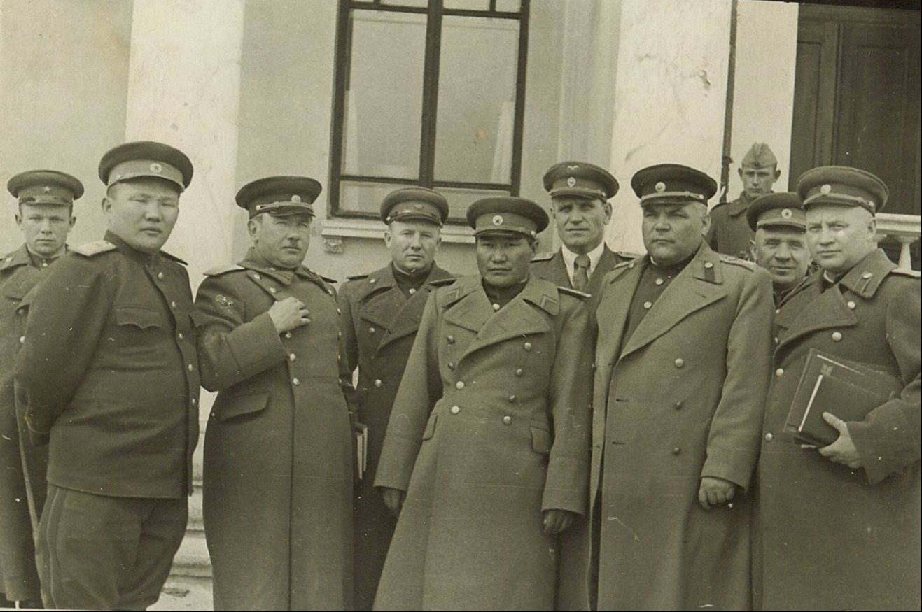 Дэслэгч генерал Ю.Цэдэнбал, зөвлөлтийн дэслэгч генерал А.И.Данилов, дэслэгч генерал Ж.Лхагвасүрэн, Зөвлөлтийн өвөр Байгалын фронтын командлагч ЗХУ-ын маршал Р.Я.Малиновский, цэргийн зөвлөх дэслэгч генерал И.Г.Рубин. 1945 он.