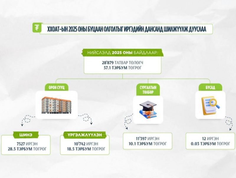 2025 оны хөнгөлөлт буцаан олголтыг иргэдийн дансанд энэ сарын 20-ноос шилжүүлж эхэлсэн бөгөөд өнөөдөр шилжүүлж дууслаа. 2025 оны жилийн эцсийн тайлангаар 28,879 татвар төлөгч иргэн 57.1 тэрбум төгрөгийн буцаан олголтыг авахаар тайлангаа ирүүлсэн юм. Тодруулбал, шинээр орон сууц худалдан аваад анх удаа хөнгөлөлт чөлөөлөлтөд хамрагдаж байгаа 7,527 иргэнд 28.5 тэрбум төгрөг, үргэлжлүүлэн хамрагдаж байгаа 10,742 иргэнд 18.5 тэрбум төгрөг, сургалтын төлбөрийн хөнгөлөлтөд хамрагдаж байгаа 11,397 иргэнд 10.1 тэрбум төгрөг, хуульд заагдсан бусад нөхцөлөөр 12 иргэнд 30 орчим сая төгрөгийн буцаан олголтыг олголоо.